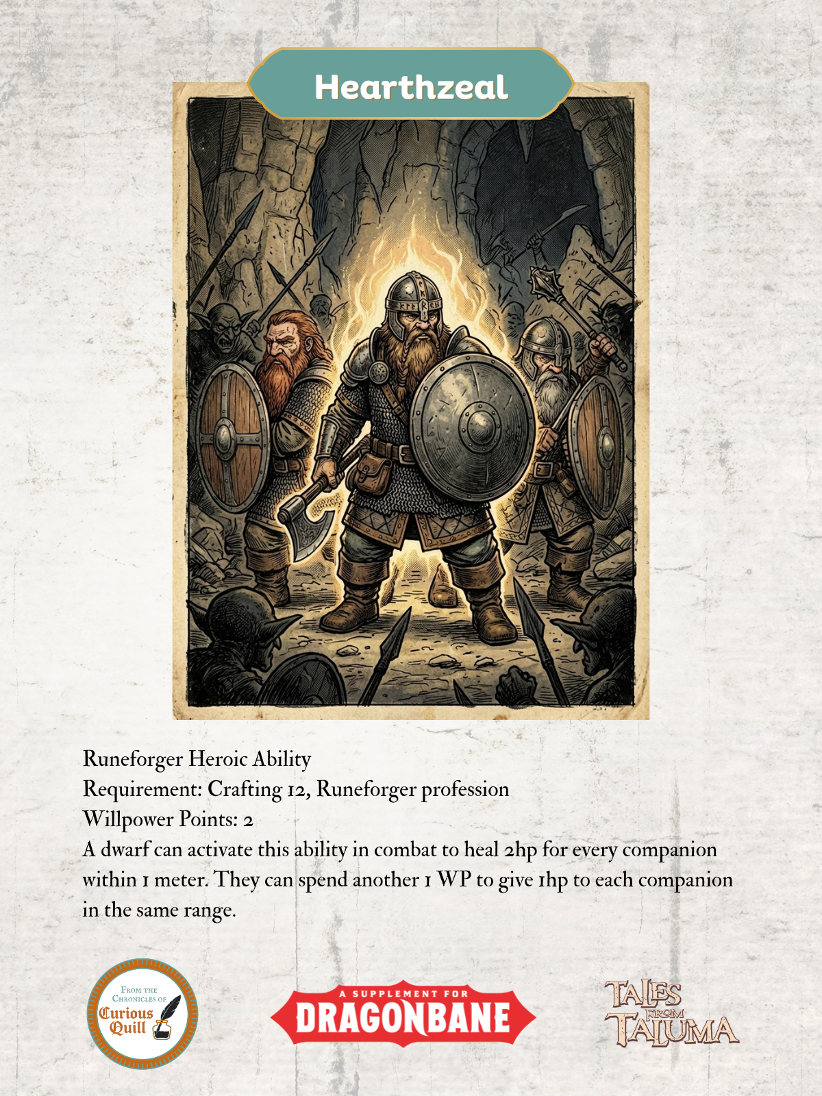 A dwarven Runeforger can learn to channel their comradeship with others to bolster their own health. The more allies they are surrounded by in close proximity the heartier they become. This Runeforger technique is called Hearthzeal. It is a Heroic Ability that can only be taken if the character’s profession is Runeforger.