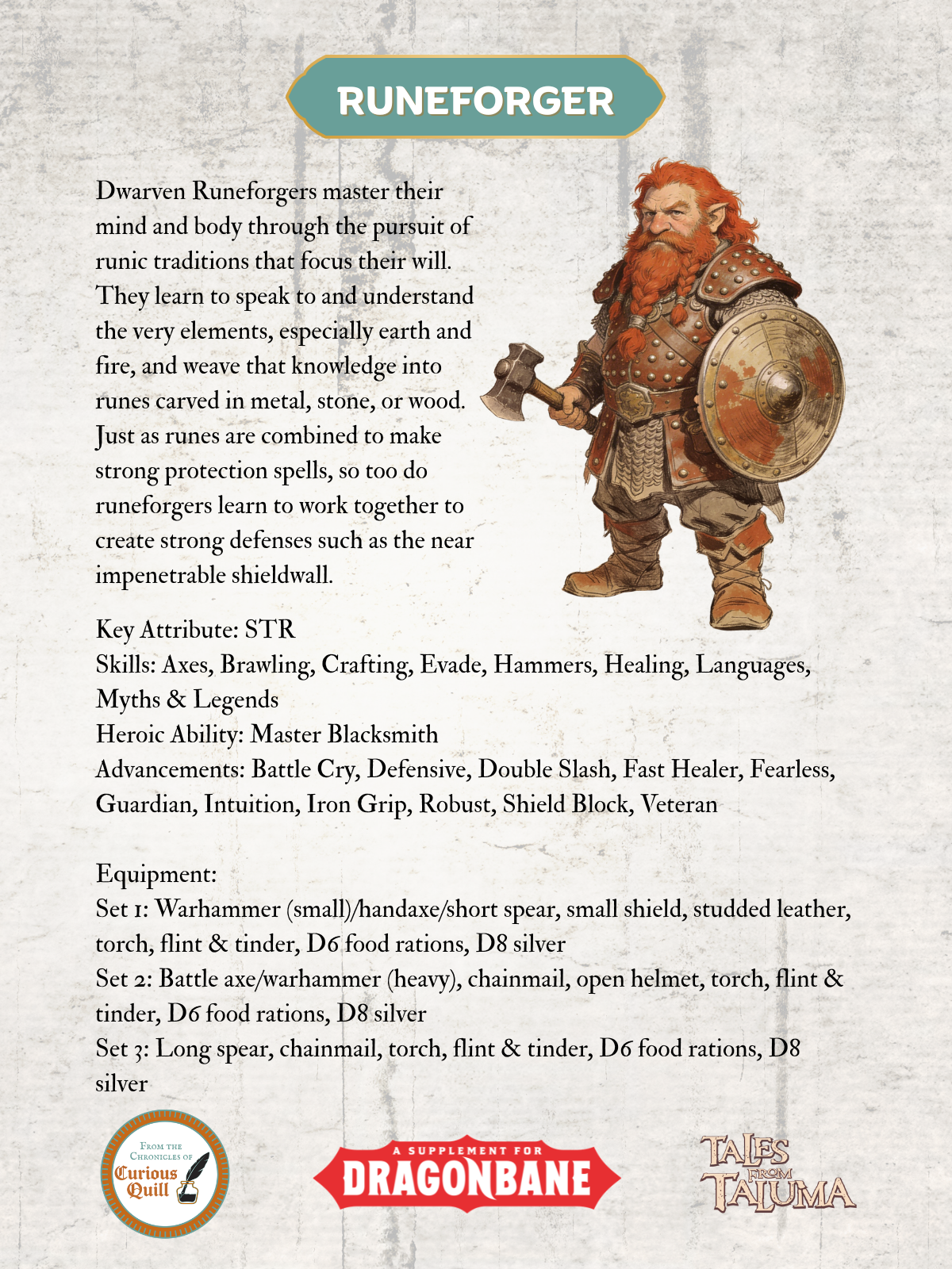 The Runeforger profession is only available to dwarf kin. Runeforgers master their mind and body through the pursuit of runic traditions that focus their will. They learn to speak to and understand the very elements, especially earth and fire, and weave that knowledge into runes carved in metal, stone, or wood. Selecting the Runeforger profession can inform much of the rest of character creation and development including helping guide later advancement selections from Heroic Abilities. Stay tuned for new Heroic Abilities exclusive to dwarf Runeforger.